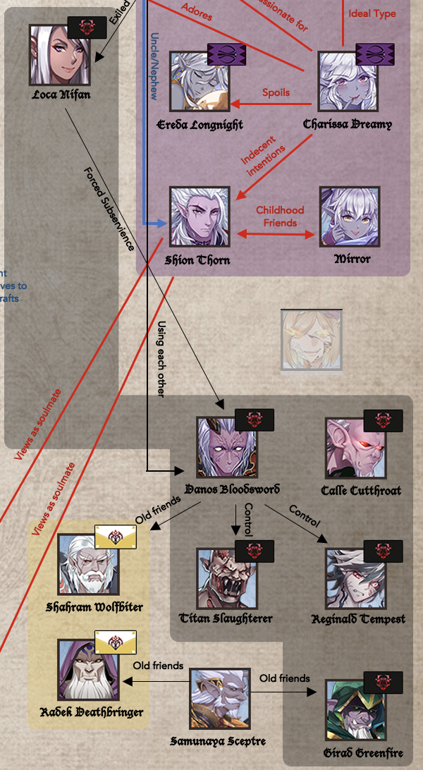 Apologies for the delay in this week's reveal, but we've went back to polish the overall appearance of the relationship map so it's all nice and shiny. But anyway: Welcome to the grand finale, where the relationship map is at long last complete! For now at least...