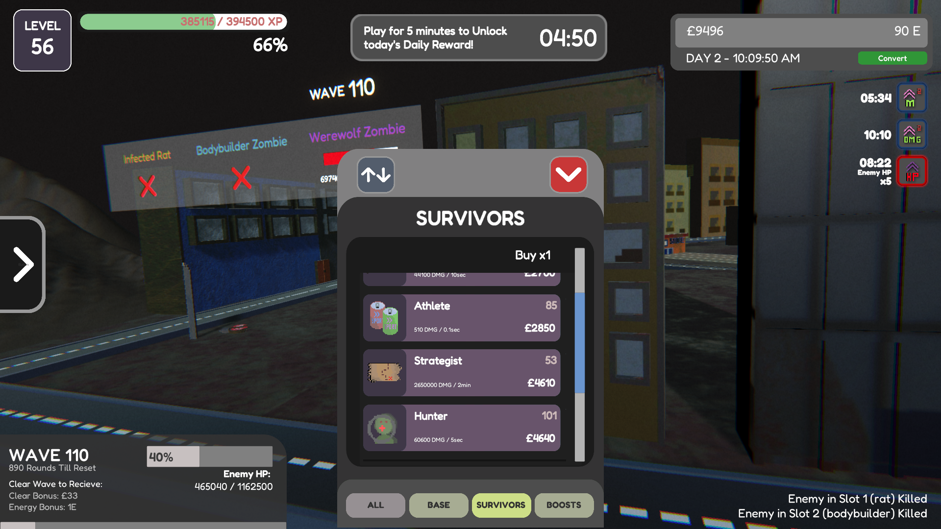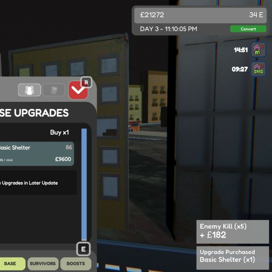 - The first 20 minutes of the game is pretty slow, this is because you've only just started and the game doesn't pick up as fast as it should do. - After this the game is pretty fun for 2-3 hours, and you can see your progress and how the zombies are being defeated faster which is pretty satisfying! - After this it's a bit TOO easy, this will get harder if i add more content but i've noticed the game needs more input from the player and more gameplay mechanics that require the player to pay attention, other than all the existing mechanics that require the player to sit back and watch, and occasionally buy upgrades.