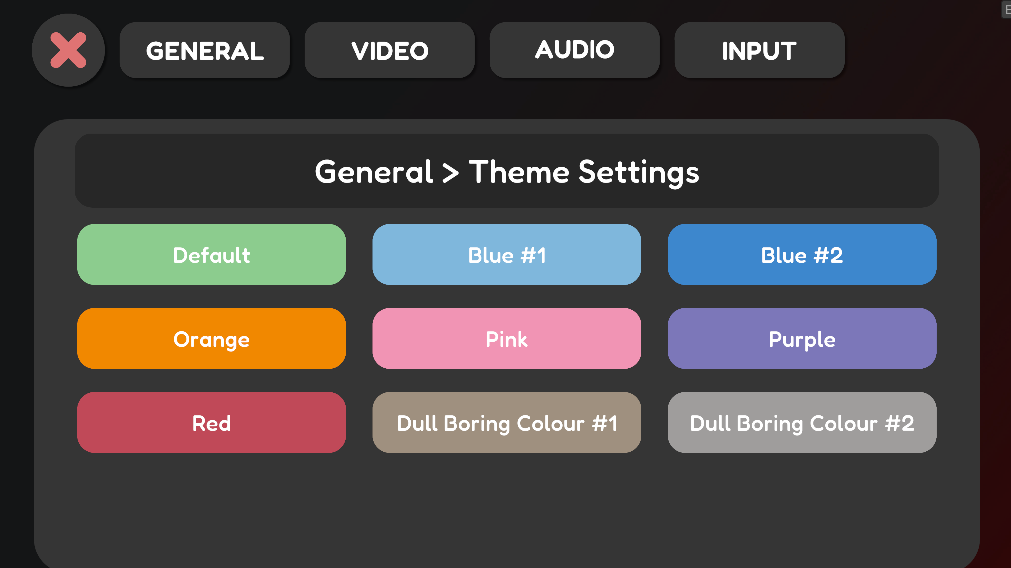 These are the current colour options I’ve added! More will be added and some will be changed slightly for reasons such as readability, or cause I have a bias over Orange and Green. I also plan to allow you to choose the very specific RGB value you like the most in future (You can technically modify the save file and do it now but no, that’s cheating (it isn’t))