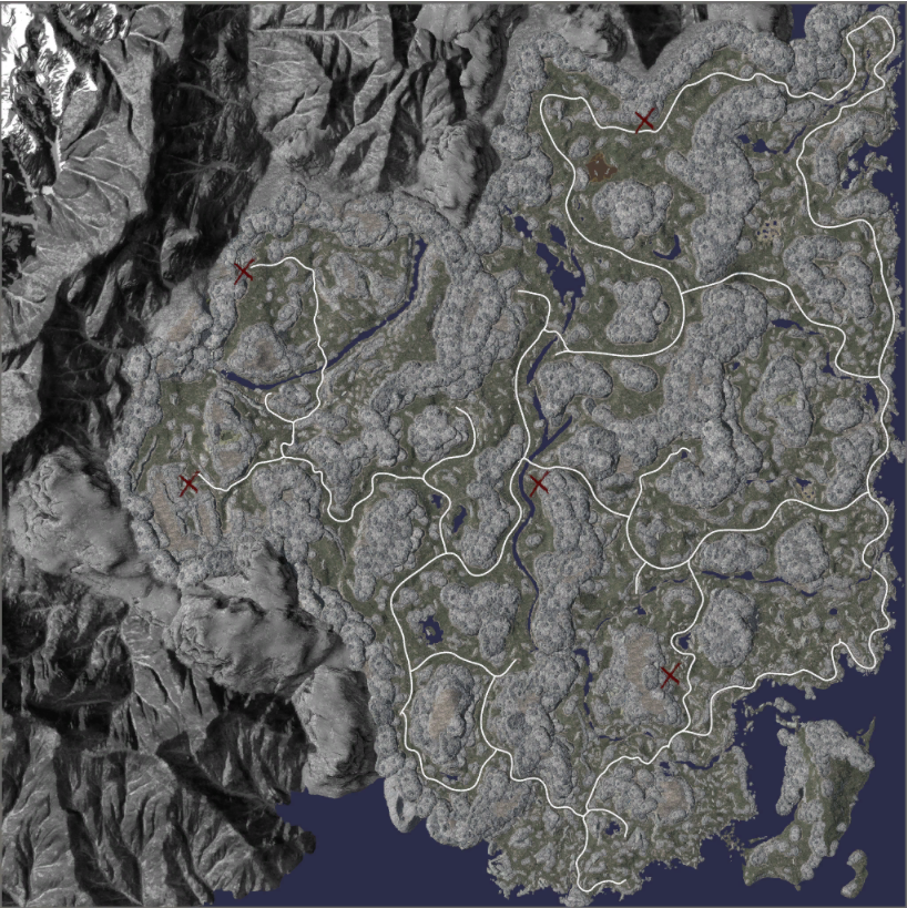 Notable changes: - This is a far more rocky and rugged terrain with a large amount of new cliff and mountain meshes. The map overlay is just a guide, we encourage folks to explore and look around. - Fish have been added to most bodies of water. - New types of POI and buildings. - New foliage - Waterfalls and rivers. - New cave systems.