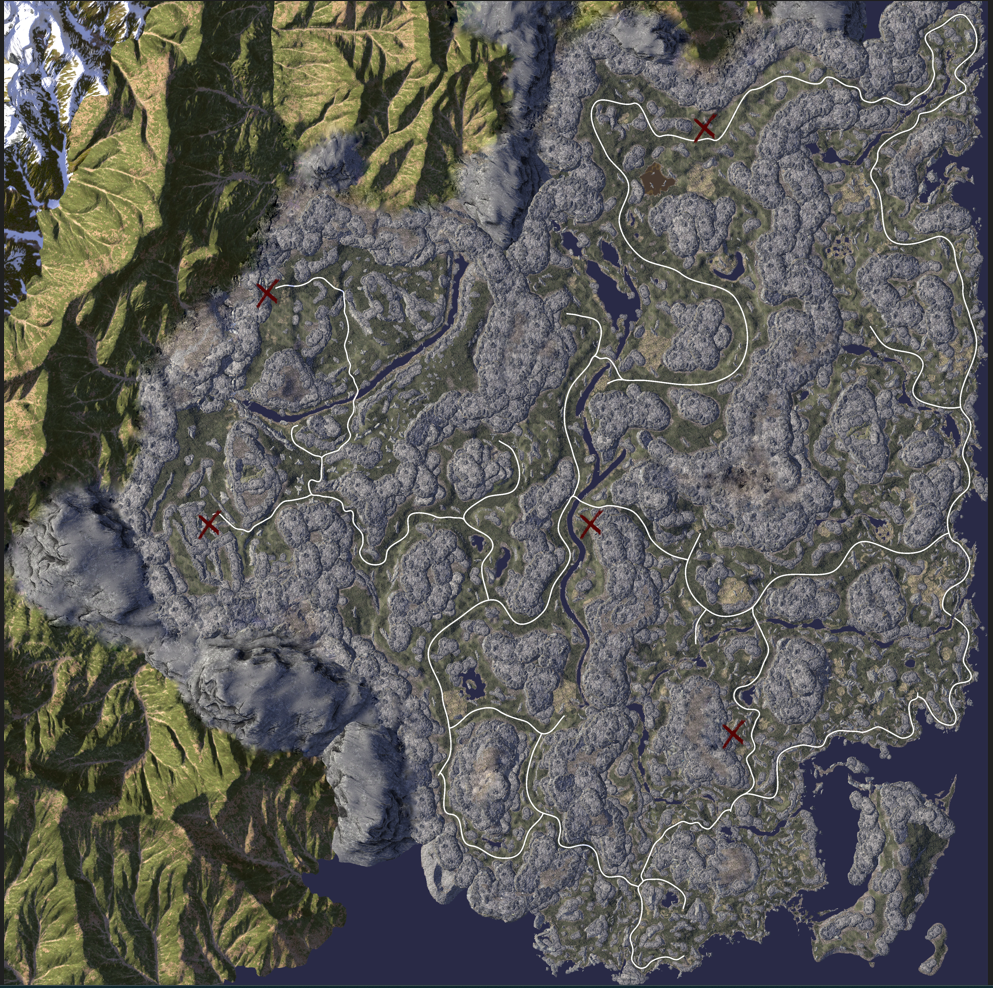 Notable changes: - This is a far more rocky and rugged terrain. A large amount of new cliff and mountain meshes. - Fish have been added to most bodies of water. - New types of POI and buildings. - New foliage - Waterfalls and rivers. - New cave systems.