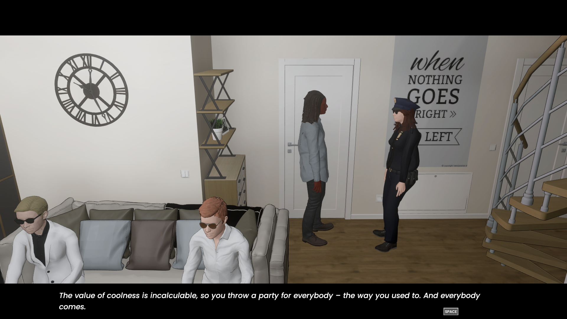 This is complex work as we're giving players a lot of freedom to act in opposition to the narrative, and want them to feel seen, while not going down too many narrative branches before our endings. We're achieving this by creating small branches that are quickly resolved and put back on track of the main branch, storing information about players' choices that affect the ending.