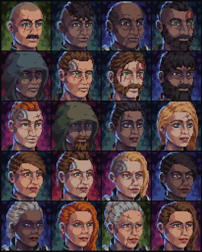 Another thing we wanted to share was our finalized character portraits. As mentioned in a previous update, each portrait face is customizable by the player (aside from the wrinkles from aging). There are 5 male and 5 female faces, but their appearance can change quite drastically based on the toggles and choices available. This is something we'll continue to expand upon after release, so you can expect the addition of more faces, hairstyles, tattoos, etc.