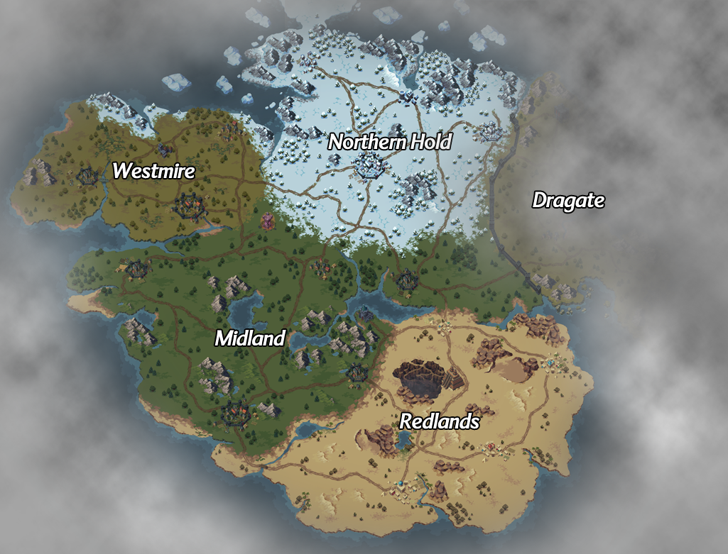 We haven't shown a ton of the map previously, other than a small portion that was in the demo and our most recent trailer. The map has undergone some changes over the course of development and internal playtesting. It now consists of 5 regions (instead of 9) and 18 cities (plus 3 faction hubs). Though it sounds like a significant alteration, the overall size of the map hasn't changed too much. We did this because the original map had some regions that were too similar and redundant (now each region has its own distinct biome), and the size of the counties were too small and cramped with as many cities as we had. We also felt that with our original version it was harder to keep track of and stay connected to the world and its ongoing affairs.