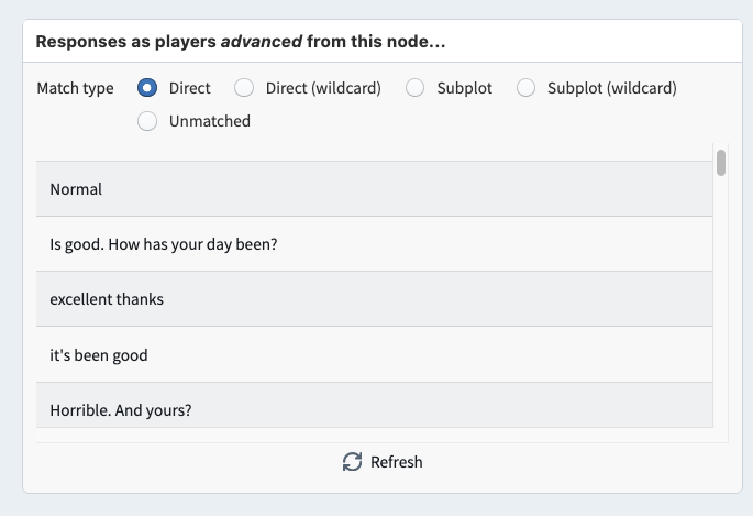 Per-node analytics listing what players have said to advance from a node asking “How has your day been?”