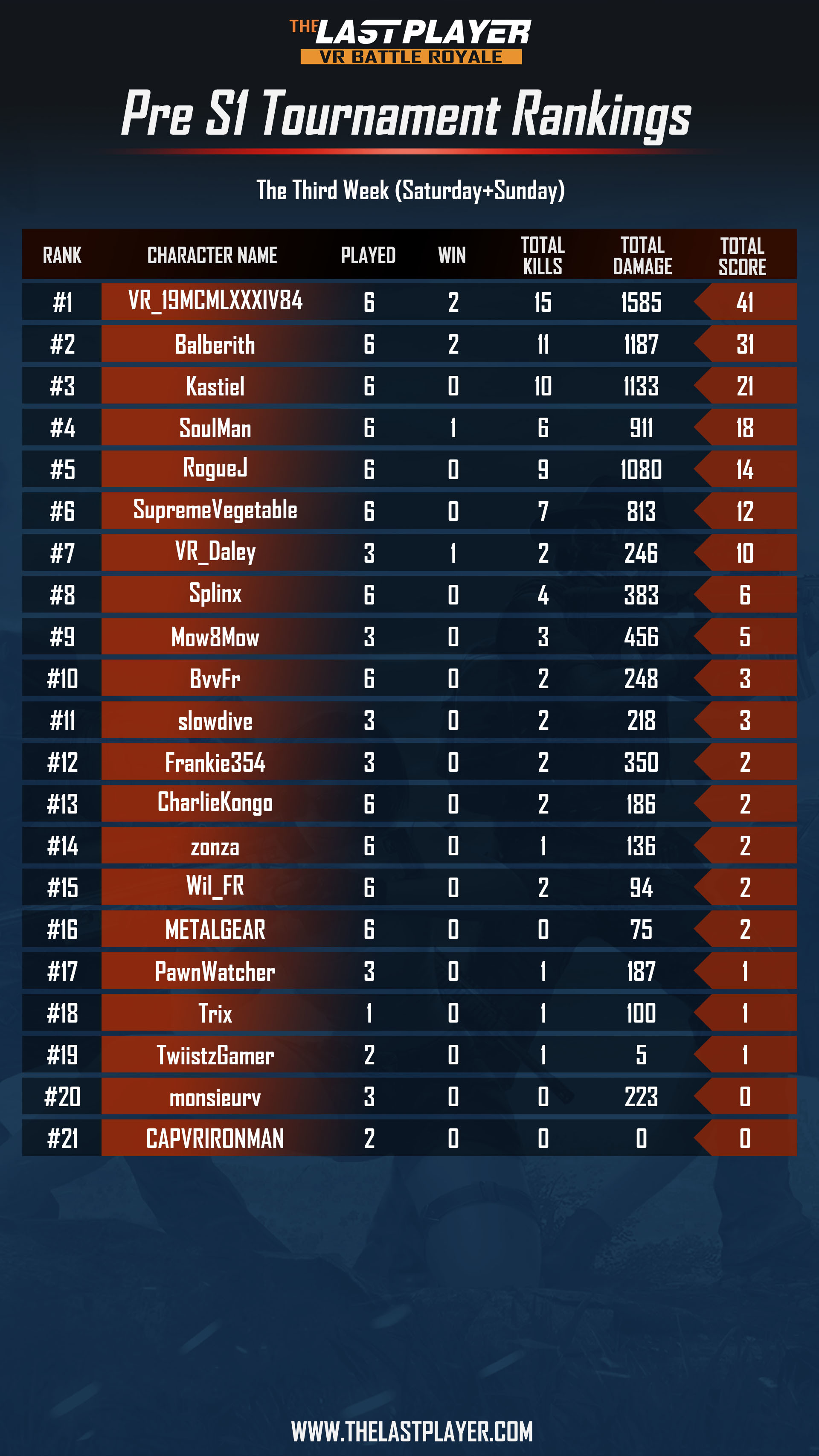 The rankings for the third week of the PRE S1 Tournament are as follows: