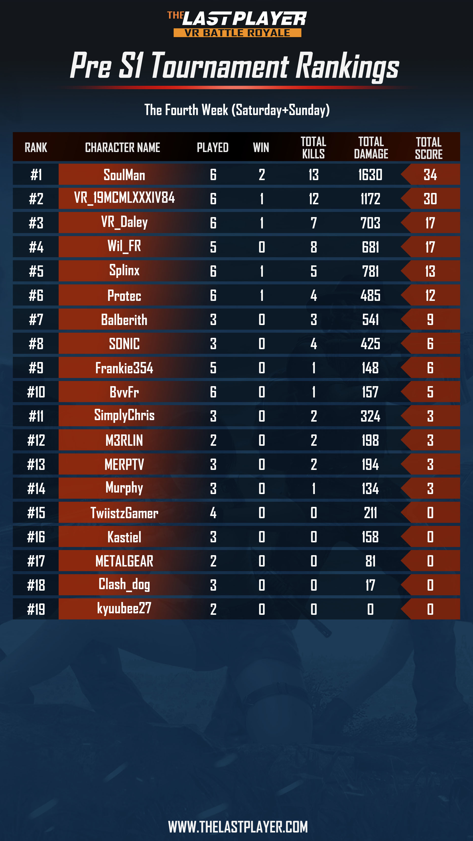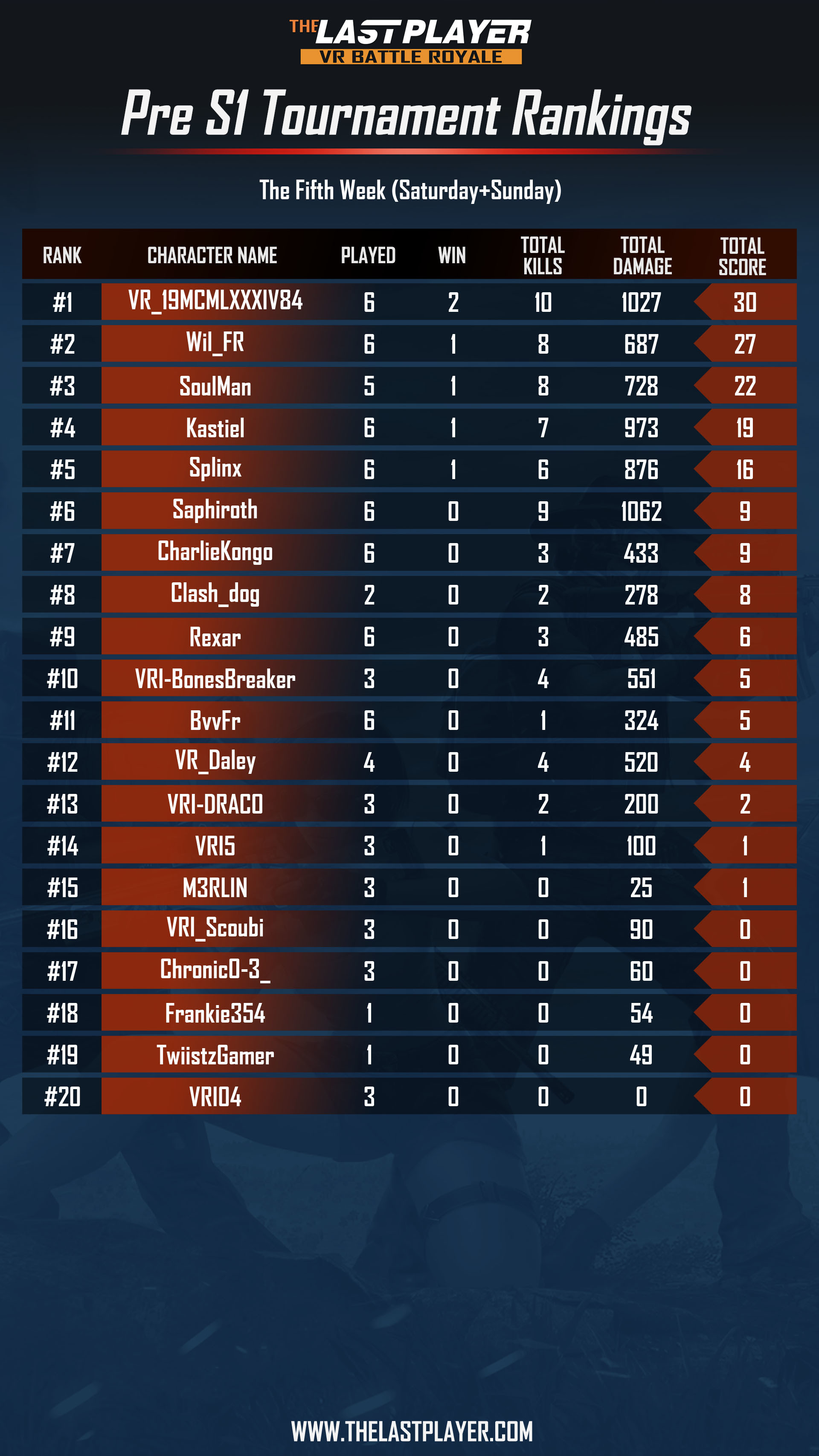 -The score rules are judged based on the number of wins, total damage value, and the total amount of kills. Calculate the scores of the per player through a formula and rank them. (Per game: #1 +8 points, #2 + 4 points, #3 +2 points, #4 and #5+ 1 points, killed 1 person + 1 points. If the points are the same, the total damage value is high for the player, ranking it in the front.)