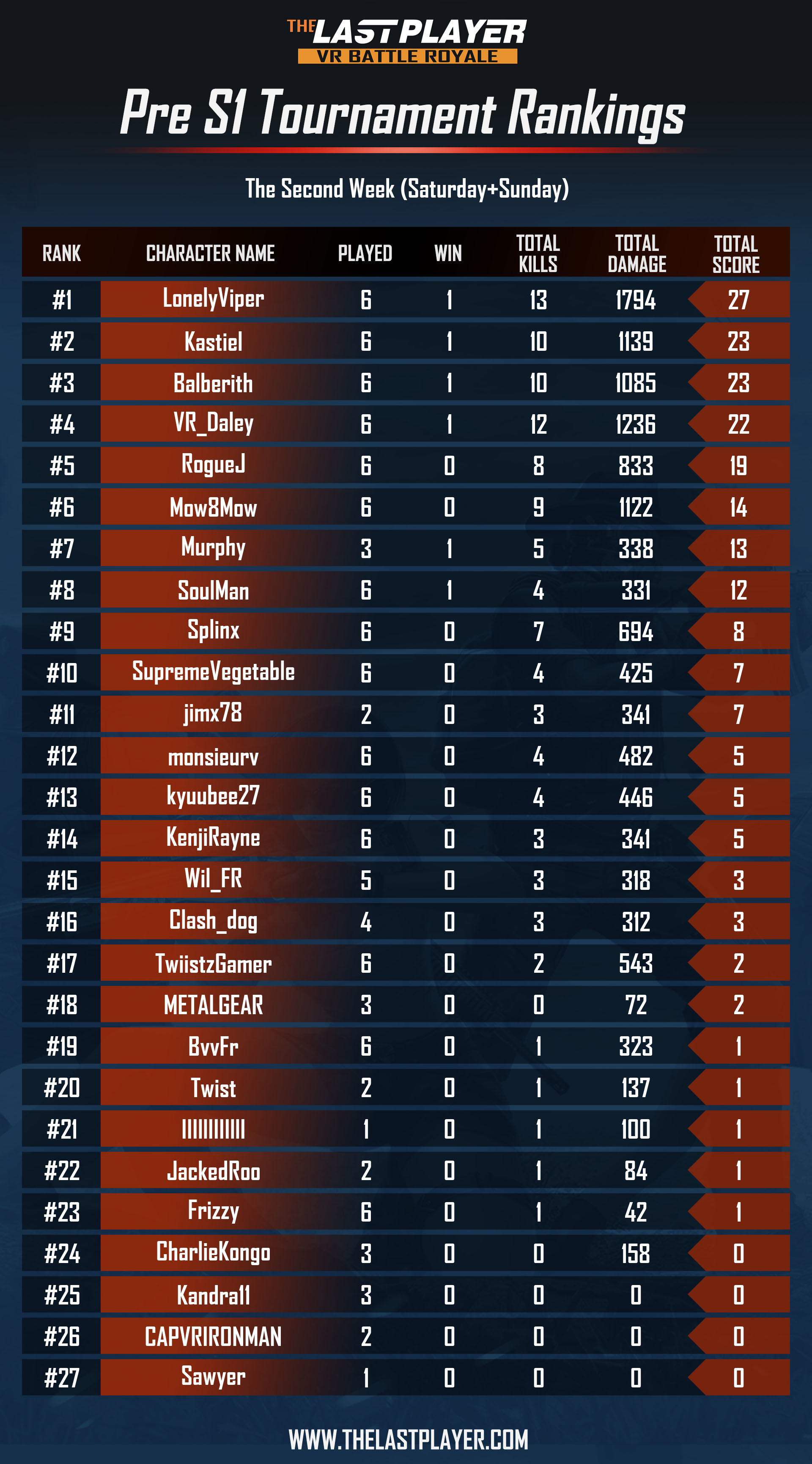 The rankings for the second week of the PRE S1 Tournament are as follows: