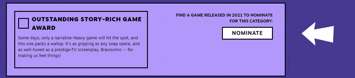 Jump on the official Steam Awards page and scroll to find the section listing the category name (Outstanding Story-Rich Game), click on the button 'Nominate' and find our game.