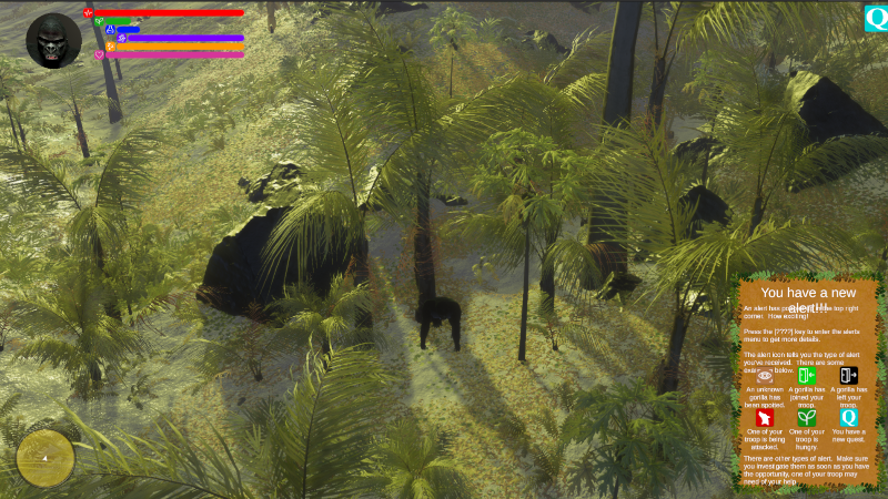 Players can now add a gorilla to their troop once they find them by increasing bonding/loyalty. You do this by giving them food, building them a nest. Next tasks are to give the player more information in game within the UI. Next up is improving the competition with the rival alpha male gorilla so he can steal your troop members. Following that there will be extra work on the non gorilla animals and AI.