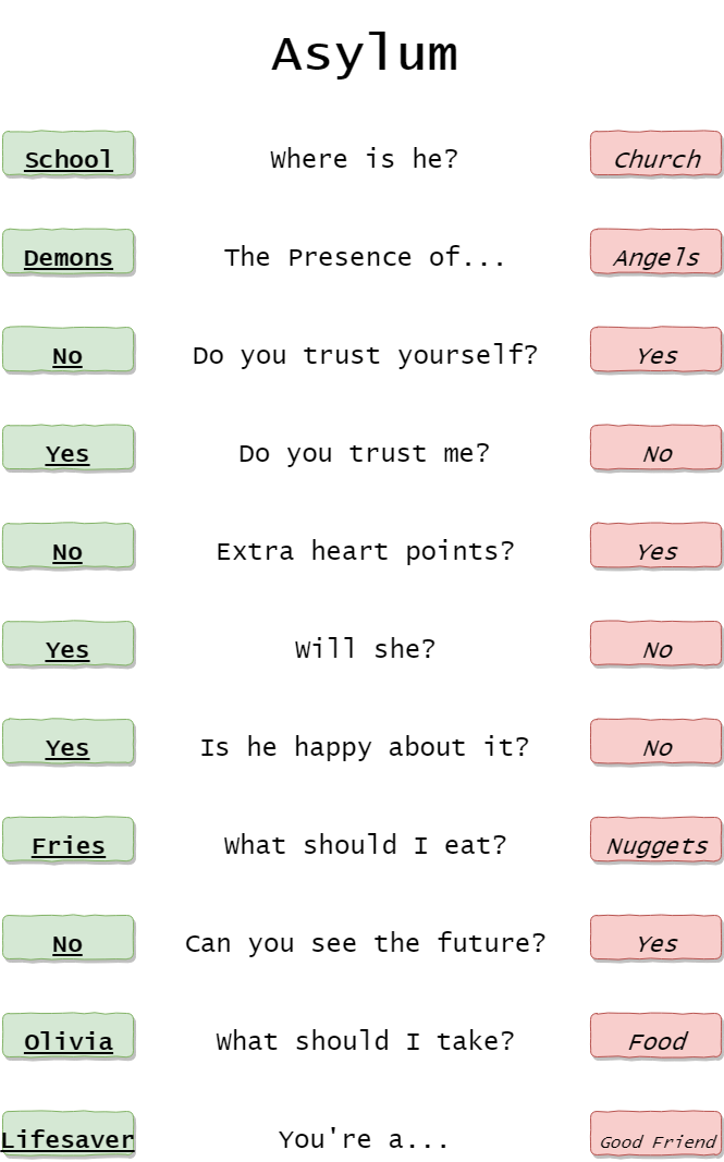 People have asked for charts to show how to get the three different endings of the first act so here they are: