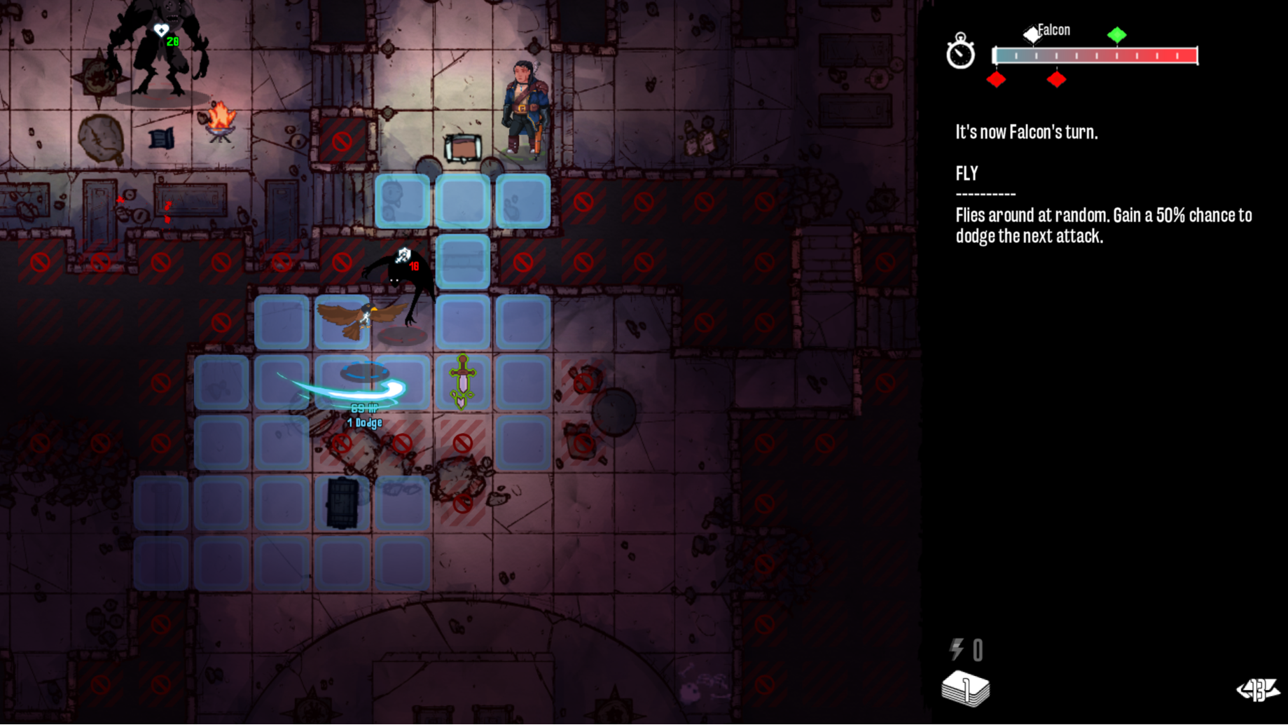 FLY: Flies around at random. Gain a 50% chance to dodge the next attack.