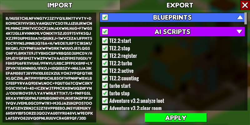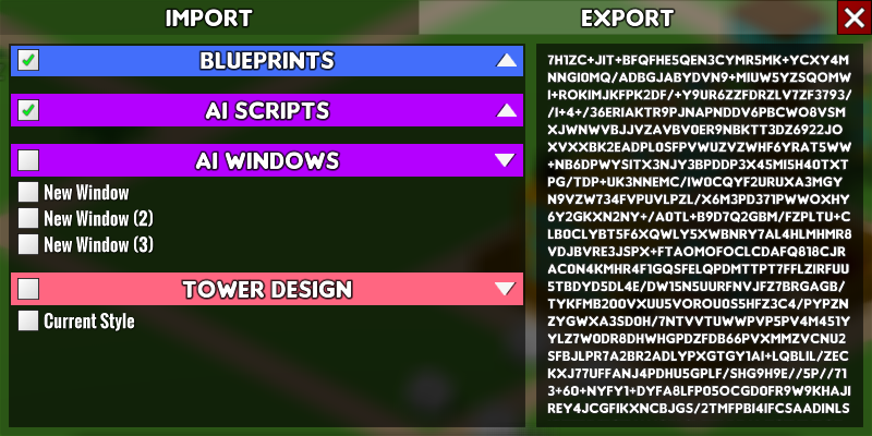 You can now export blueprints, AI scripts, AI windows and even tower styles using a single export code. It also features a preview of the data you want to import together which any requirements you have to fulfill (like RAM requirements in the case of AI scripts or modules in the case of blueprints). You can freely select which one of the things contained inside the code you want to import and which you don't. Similar on the export side you can now simply select what you want to export and it will instantly generate a shareable export-code for you.