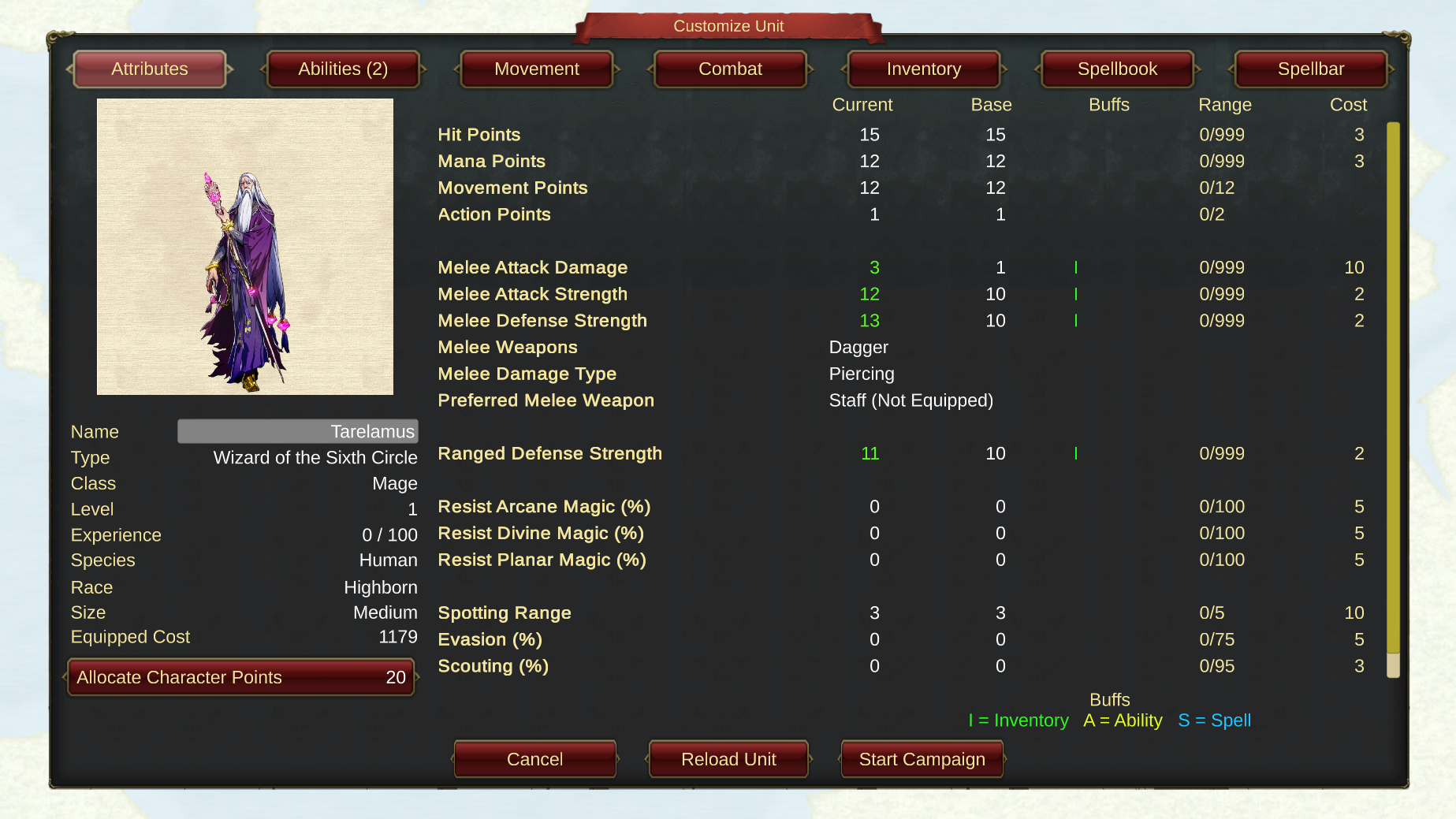 Note that some of the Current values are higher than the Base values. This is because the Mage has an item 'equipped' in the Inventory which improves these stats (and is indicated by the green 'I' in the buffs column). The type of weapon equipped, it's damage type and whether this is a 'Preferred Weapon' are also shown.