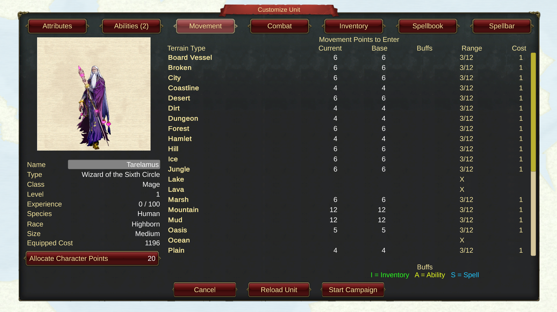Movement Every unit has the same number of Movement Points and this section defines how many points are spent to enter tiles of a particular type. There are 25+ ground types in the game from plains, hill and swamp to ocean, sea and stream.