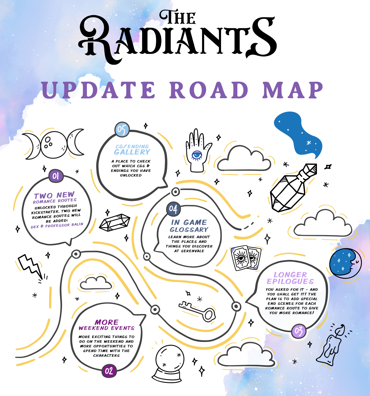 Since we will be adding two new romance routes that were unlocked through Kickstarter, these stories and features will be included with those special romance updates. So hopefully this isn't too disappointing!