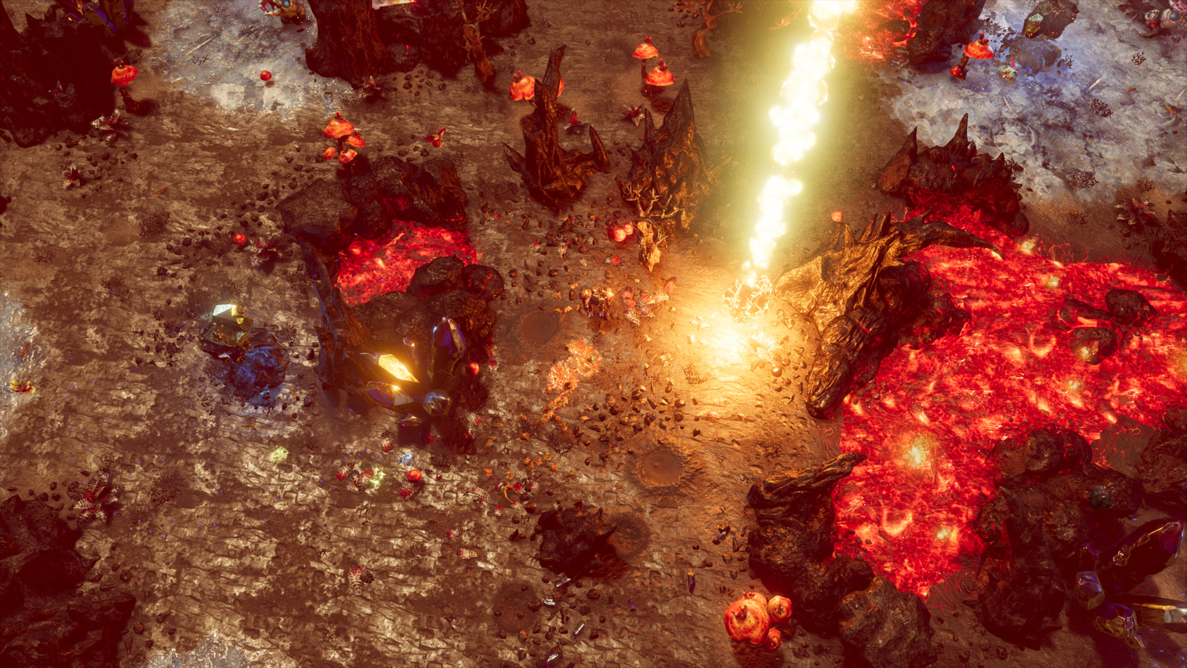 As you would expect, being in close proximity to an active volcano makes the ambient temperature significantly higher than normal. Even the robust and well-tested Riftbreaker technology starts breaking down over time due to the heat. In order to build any structures, you will have to find a way to bring the temperature down a notch. Oddly enough, nature has found a way to sustain life even here, so perhaps you should look for inspiration in your surroundings?