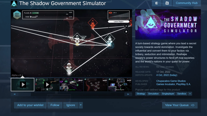 There is nothing left for us to invite you to buy a The Shadow Government Simulator and enjoy several hours of amazing gameplay. We also thank you for the whole community that was with us during this period. ๐ค