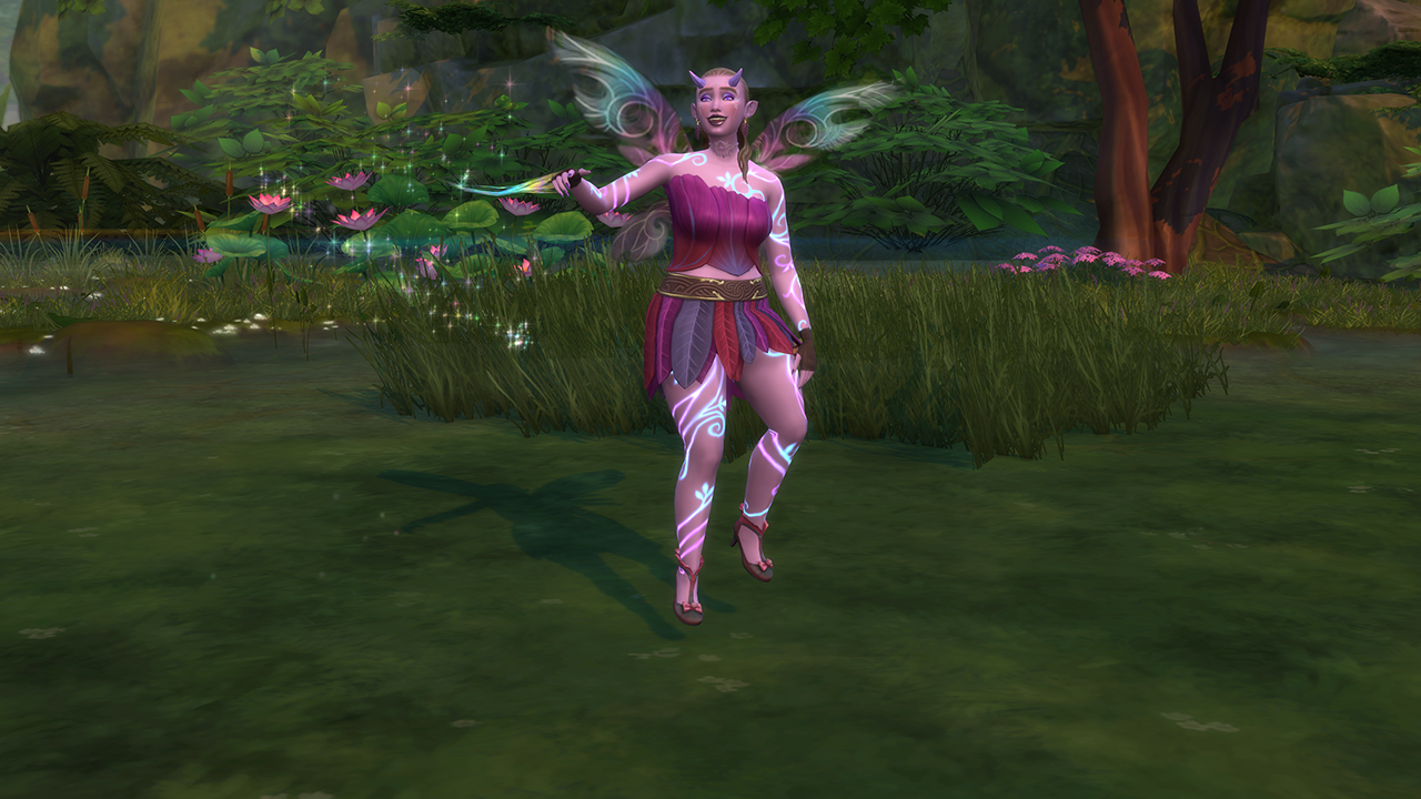 This wonderous world is also home to Fairy Sims. Fairies have stunning wings and can develop fantastical abilities that let them nurture plants, change the moods of others, and a whole lot more. A kindly Fairy might improve a Sim's luck, while one that's feeling mischievous might bestow an Ailment. Fairies also produce Fairy Dust, which any Sim can use to enchant plants or bring Gnomes to life. Fairy Dust can also be found in the world.