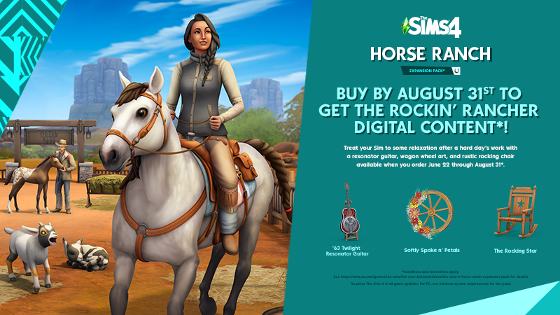 Order The Sims™ 4 Horse Ranch Expansion Pack through August 31 to receive the Rockin’ Rancher Digital Content: a resonator guitar, wagon wheel art, and a rocking chair.