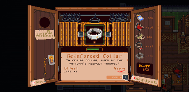 Every Trinket can grant a bonus and lower the player’s score or can grant a malus and raise the player’s score. To get a Trinket, the player must defeat bosses and every boss can drop three Trinkets. Tier 1 Trinkets are dropped just by beating a boss, tier 2 Trinkets are dropped if the player beat a boss without losing hearts and tier 3 Trinkets are dropped if the player beats a Boss without any typing errors. Players start with 0 slots and by simply progressing with the story they will gain slots up to a maximum of 5. Trinkets can be equipped at the wardrobe in the hub. While equipping those, some simple rules are applied: players cannot equip as many Bonus Trinkets so the Score percentage is equal or less than 0%. Only one Action Trinket can be equipped at a time (Action Trinkets are activated by pressing SPACE), and the Monocle is the only Trinket used to access Hardcore Boss Fights and it's the only Trinket that must be equipped alone.