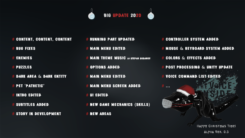 For us, 2019 has been a huge journey, bringing our first game dev project to life, up to a playable demo version, which we could show on several great events! So, what comes next? The new year comes with a lot of ideas and big decisions. For 2020 the plan is to keep improving the game, implement more content, upgrade the game mechanics and the speech recognition, to give The Voice Inside more fullness. For these plans, we’ve decided to take more development time in 2020, as we’ve had already hinted. Thank you for your support.