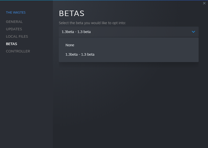 In order to opt in to the play test, you have to right click onto The Wastes in your Steam Library and select "Properties..." In the Properties menu, you should see a section named "Beta," and inside you should see a pop down option with "None" on it. Click on it and select the "1.3beta" option (as photographed below) and Steam will start downloading the v1.3 Play Test build. From there, you should be able to launch the game and start fragging.