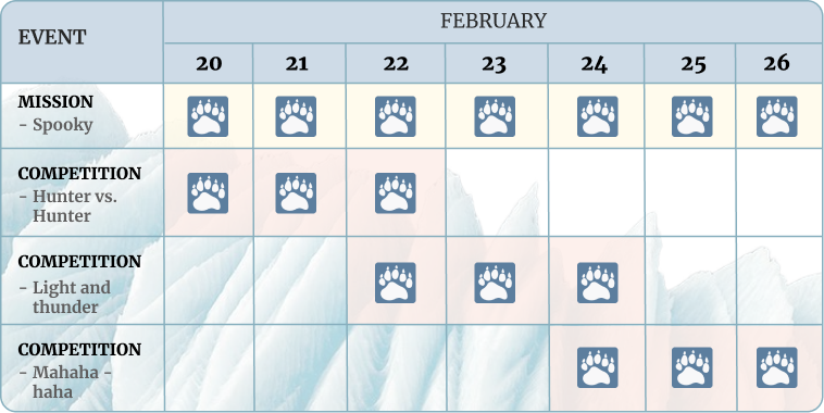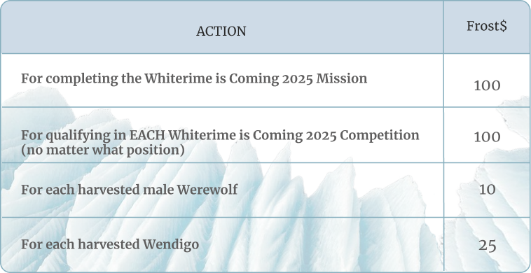 As we move into the worst of frostbite weather in the frozen north, it's time to bundle up inside with a warm drink and some game time. Join us for a campaign, 3 competitions, and a mission in Whiterime Ridge. Be careful while you're out there though, the cold isn't the only thing you have to deal with, but Van's got you covered on all fronts. Load up the silver, and we'll see you in Whiterime Ridge for a monster hunt. Mind the Wendigos. They're extra grumpy because COTW teased it first. They were really looking forward to being a surprise.
