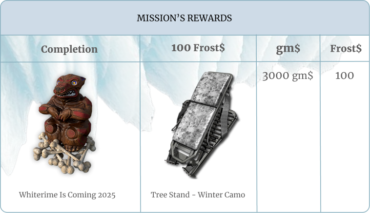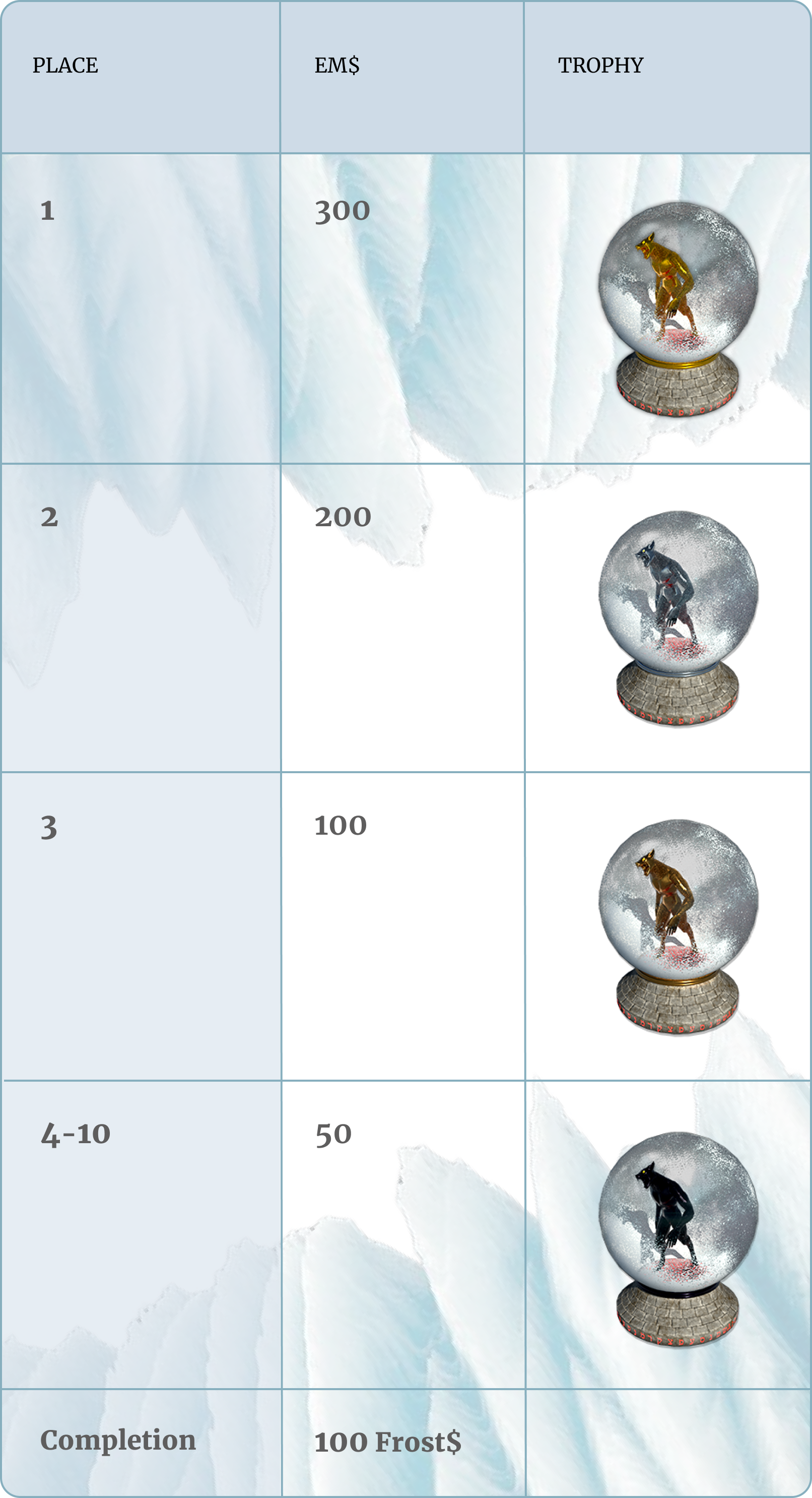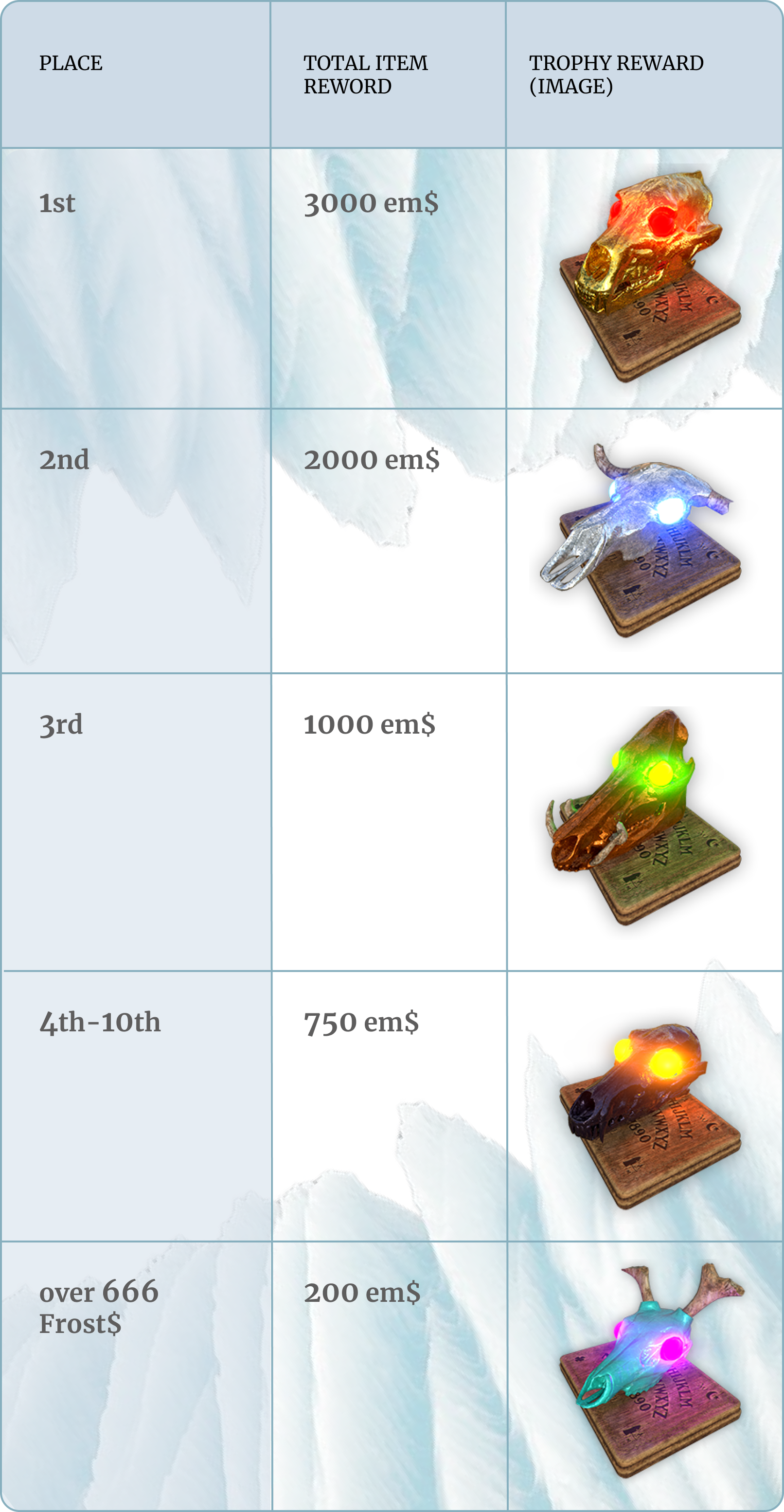 Participate for the prizes, the trophies, and the glory! The hunter with the most Frost$ at the end of the event will win Community Prizes!