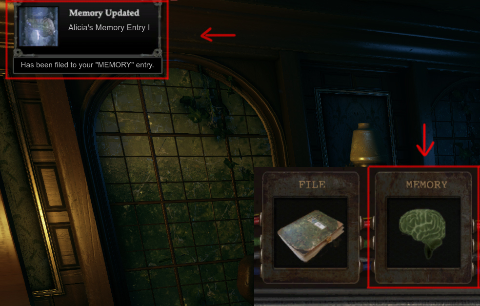 3. After Alicia wakes up cinematic ends player is now notified that has a memory entry, and that can read all feature updated memory *when showing on-screen* from inside inventory. - we made it this way because these entry memories will become later important, explaining how to use specific items -