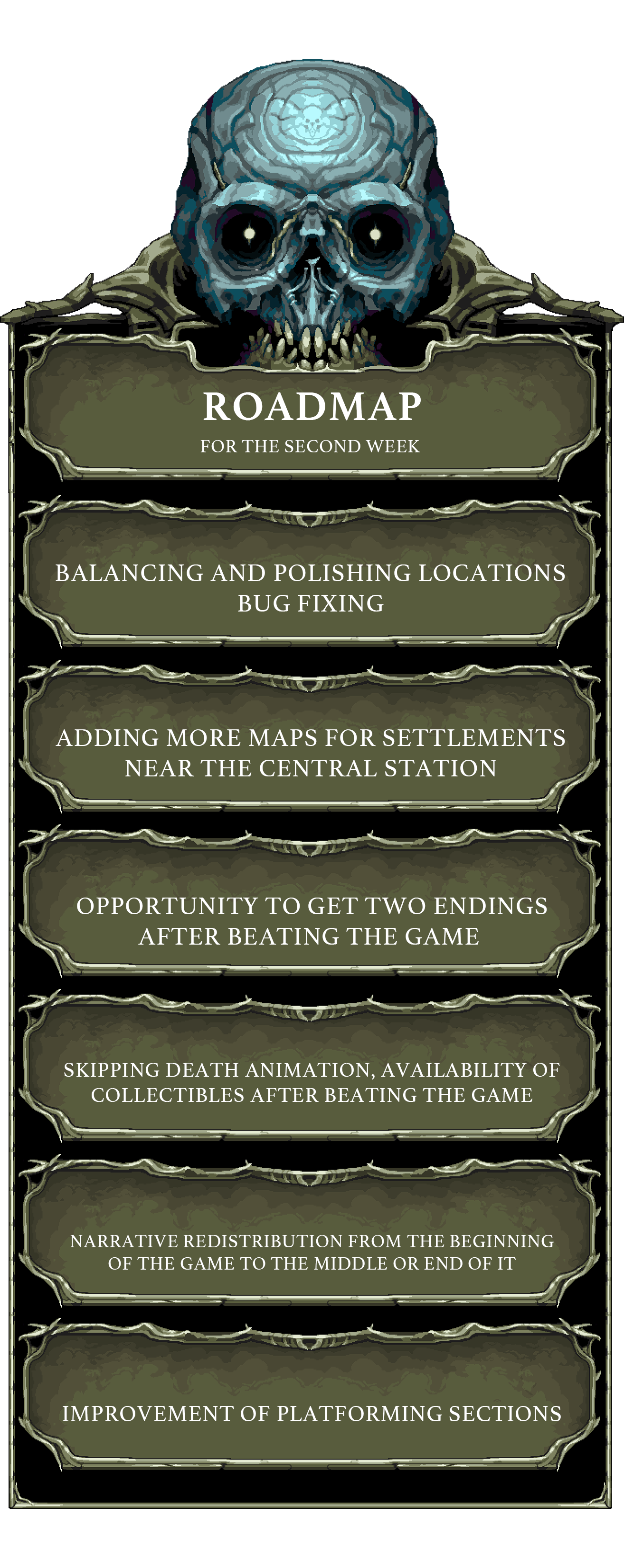 Be sure to update the game for 1.0.4 ver.! The roadmap is almost finished, platforming sections would be improved soon, and more updates are coming next week!