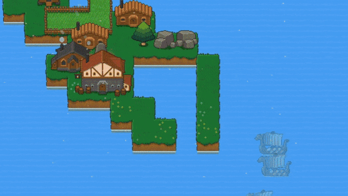 After the UI, I turned my attention to the grass / land. This is effectively the canvas that you’re painting on, so I wanted to simplify this quite a bit. You can see from the edges that I’ve chunkified it a bit, as well as toned down the colour to allow the other sprites to stand out against it (you can see as well that I changed the trees and rocks to pop a bit more):