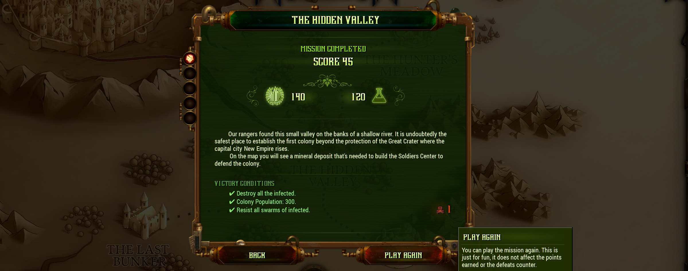 Now you can play missions that you have already completed, as many times as you want in the difficulty level you want. This functionality is just for fun, it will not affect any aspect of your campaign, nor the victory points or the defeats counter.