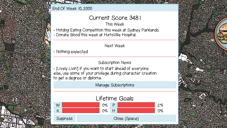 When in Survival Mode, your current score is displayed prominently on the weekly summary. What do you want to achieve in your remaining time? You can aim for maximum happiness, wealth or knowledge, or just try to get as high a score as possible. You could also try to stay alive as long as you can.