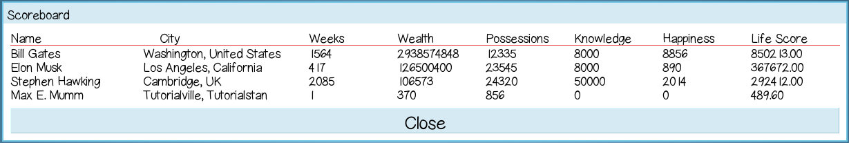 The local scoreboard will keep track of all the lives you've lived. Every time you win a game, a final score is calculated and added to the board. Below is what it looks like with some scores I made up.