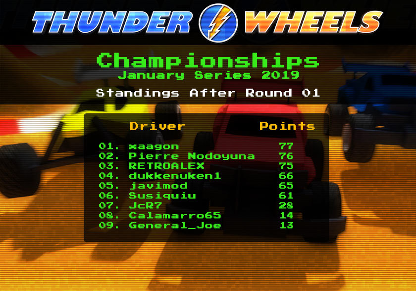 xaagon and RETROALEX with 1 win each and Pierre Nodoyuna with 2 wins... where nose to tail in a close fight all round long finishing with only 2 points between them !! the closer start we ever had!! :D