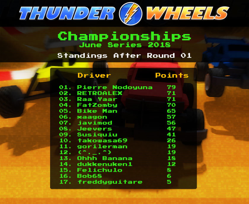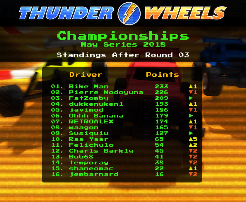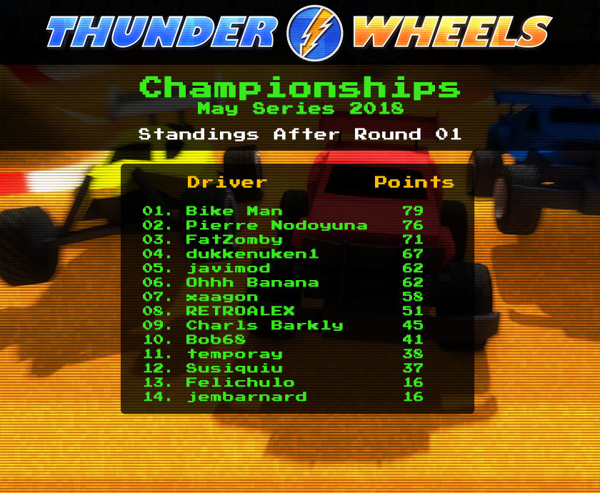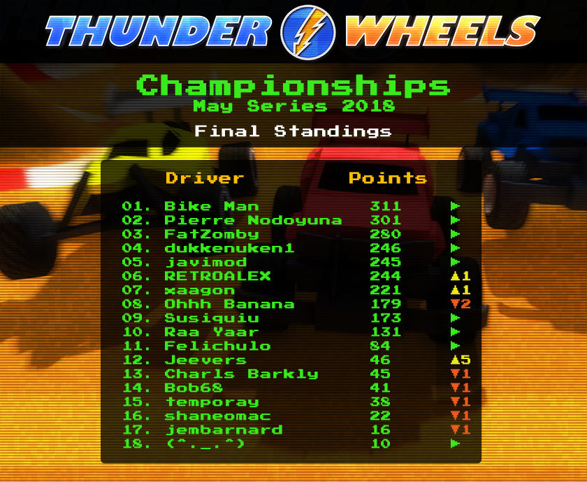Was an exciting one with lots of overtakes during the week and at the end was as usual :D another very strong weekend for Bike Man winning the HOT-LAP the MULTI-TRACK and the ENDURANCE competitions winning his first Championship in ThunderWheels!! congrats!!