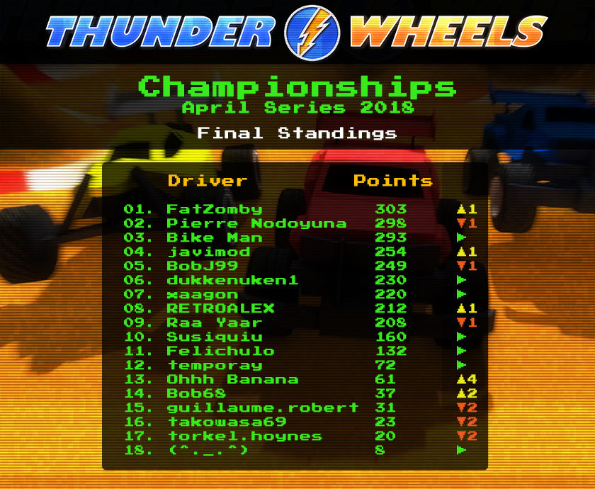 Lots of surprises this time... FatZomby and Pierre Nodoyuna with unusual performance not winning any competition but Zombie was the stronger and did just what needed to win the first ever ThunderWheels Championship Series!! Congrats!!!