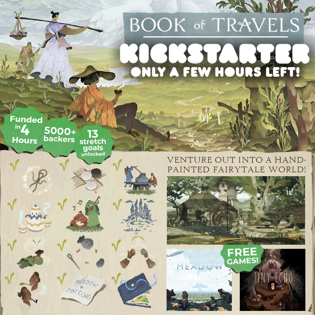 Free games now included + map book We want to make sure you don't miss out on our last little bit of Kickstarter adventure... It's been a crazy campaign and we've flown a little bit by the seat of our pants, which included adding some extra free things to the rewards bundles. Every pledge Traveller and above now gets Meadow + an illustrated Map Book, and every pledge Settler and above gets (Meadow and) Tiny Echo + an illustrated Map Book. (If you already have these games you are free to give the key to a friend!)