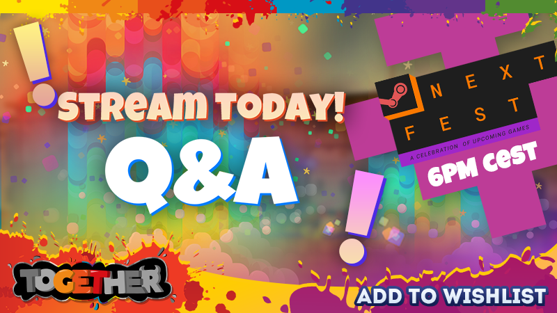 The Steam Next Fest is here and we’re launching the demo of our colorful platformer TOGETHER - free! Join the week-long online celebration, download and play the exclusive demo version of our game, watch the live streams, participate in the giveaways and chat with us during the Q&A sessions.