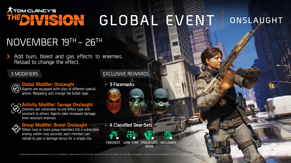 The sixth Global Event, Onslaught, is returning to The Division! Agents will have to adapt their playstyles around three global modifiers that change the pace of the game. Utilize three variations of special ammo to deal more damage!