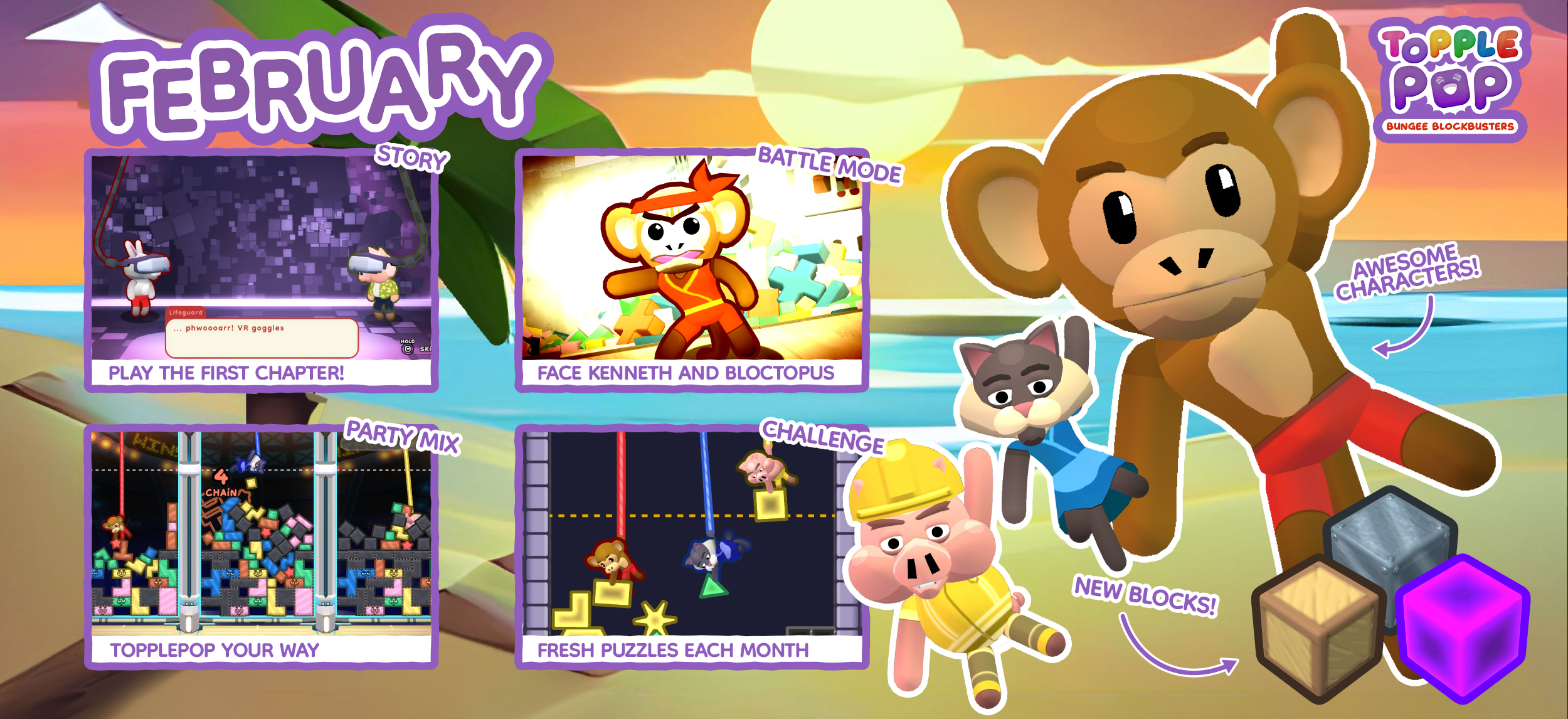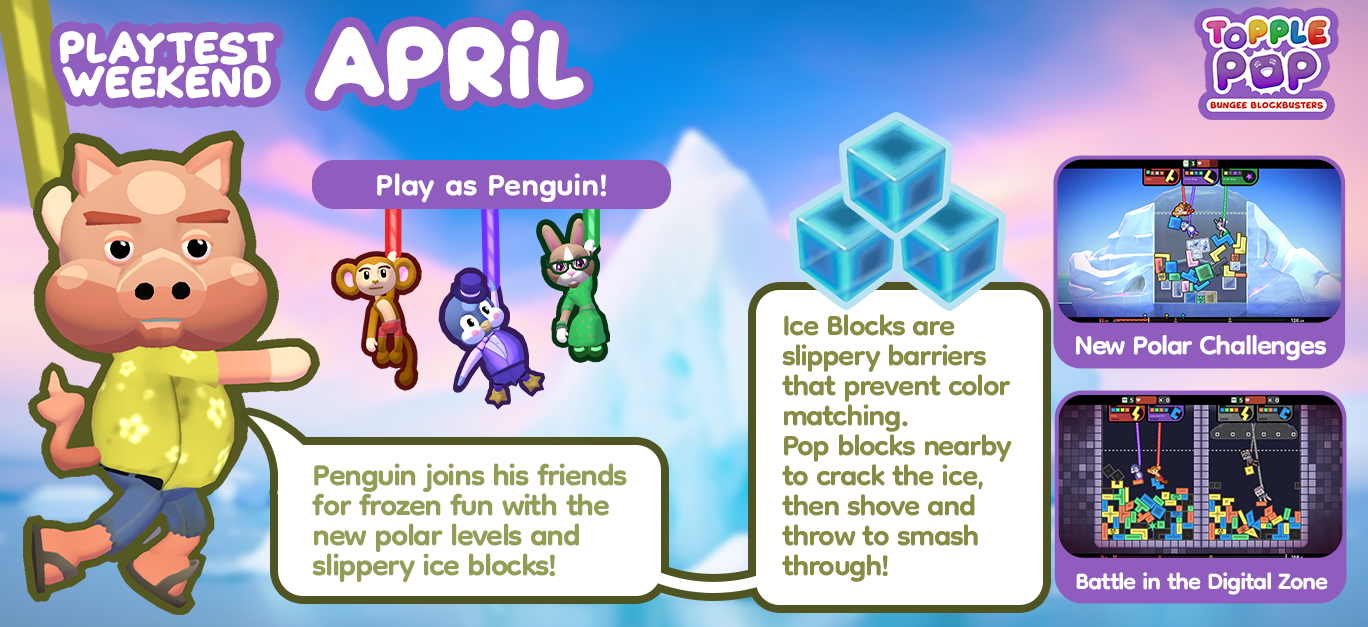 As we approach the official Steam release of TopplePOP, we’re introducing a new way to play. The Demo version will be removed from the Steam store as we commence monthly Playtest Weekends. Each month, the Playtest will include new gameplay, characters, outfits and more - we invite you to join us on the journey along our roadmap to launch. Bungee on down to explore the new additions, take on new challenges and let us know what you think - we’re excited to drop new surprises every month!