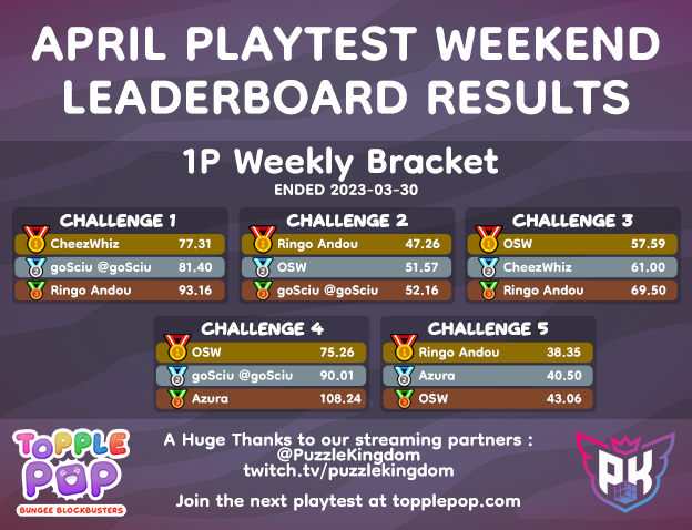 Once again, thank you to everyone who participated in the April TopplePOP Playtest weekend! Your support and feedback are invaluable in helping us continue to improve and expand TopplePOP for players around the world. We can't wait to see what you accomplish in future playtests and events!