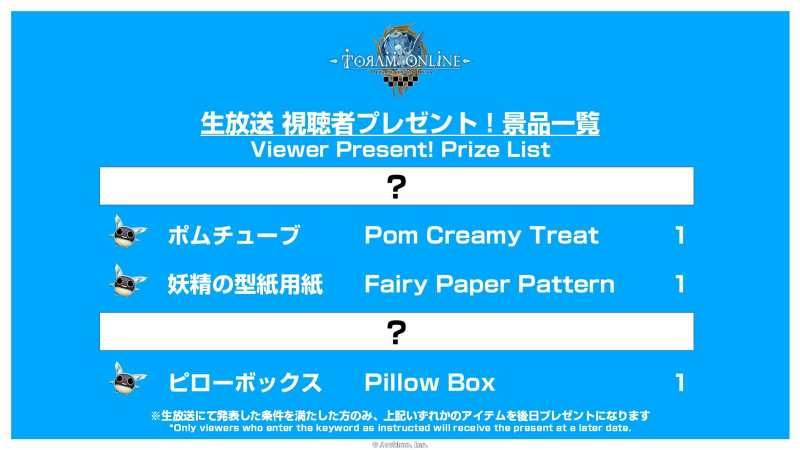 *Only the players who enter the livestream "keyword" at the determined place during the specified time are eligible for the gift. *"Keyword Gift will be sent at a later date!" will be shown when the keyword has been received. *You need to enter the "keyword" exactly the same as instructed. You will not be eligible for the gift if you make some changes to the keyword while equipping certain avatars. * If you are playing on a platform with an active 30 Days Ticket, the deadline for entering the "keyword" will be extended by 10 hours.