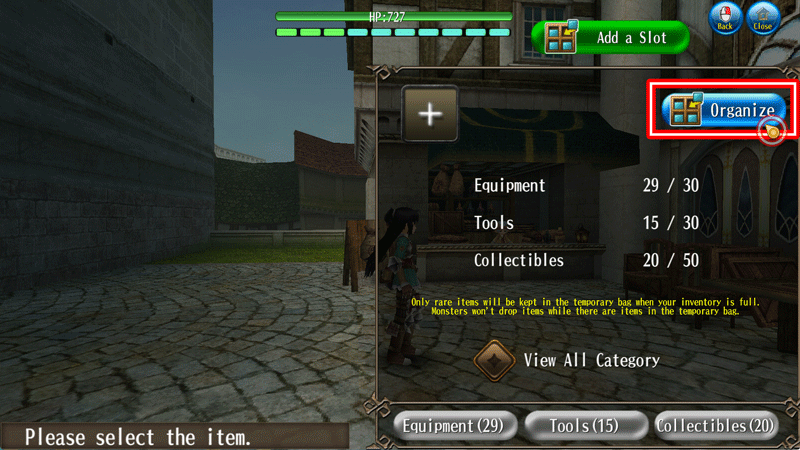 The same items will be stacked up to the maximum stack limit using the "Organize" feature.