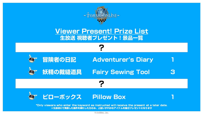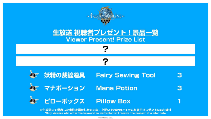 [table] [tr] [th]MC[/th] [td]Sarah(Asobimo EN Toram English MC)[/td] [/tr] [/table] *Only the players who enter the livestream "keyword" at the determined place during the specified time are eligible for the gift. *"Keyword Gift will be sent at a later date!" will be shown when the keyword has been received. *You need to enter the "keyword" exactly the same as instructed. You will not be eligible for the gift if you make some changes to the keyword while equipping certain avatars. * If you are playing on a platform with an active 30 Days Ticket, the deadline for entering the "keyword" will be extended by 10 hours.