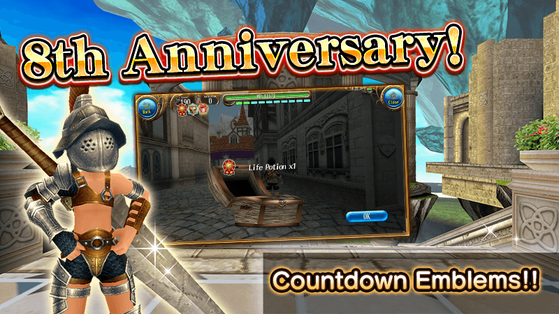 [table][tr][th]Emblem[/th][th]Condition[/th][th]Reward[/th][/tr][tr][td]8th Anniversary Countdown A[/td][td]Logged in to the game[/td][td]Life Potion x 1[/td][/tr][tr][td]8th Anniversary Countdown B[/td][td]Defeated 100 monsters[/td][td]Revive Droplet x 2[/td][/tr][tr][td]8th Anniversary Countdown C[/td][td]Played for 1 hour today[/td][td]Ticket Piece x 50[/td][/tr][/table] Make sure to play Toram Online every day and get various handy items!