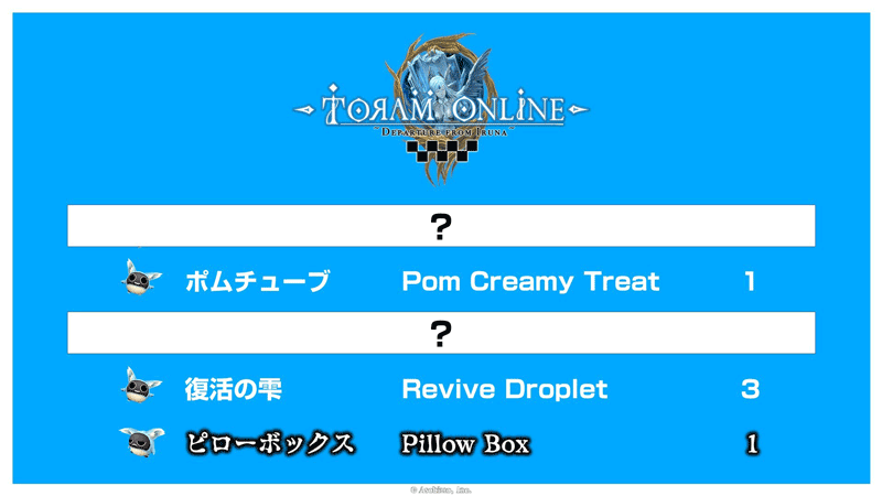 [table] [tr] [th]MC[/th] [td]Pillow Kitagawa[/td] [/tr] [tr] [th]Cast[/th] [td]Sarah(Bemmo Channel Toram English MC)[/td] [/tr] [/table] *Only the players who enter the livestream "keyword" at the determined place during the specified time are eligible for the gift. *"Keyword Gift will be sent at a later date!" will be shown when the keyword has been received. *You need to enter the "keyword" exactly the same as instructed. You will not be eligible for the gift if you make some changes to the keyword while equipping certain avatars. *Please note that schedule of live streams, content, and presenters may be subject to change without notice.