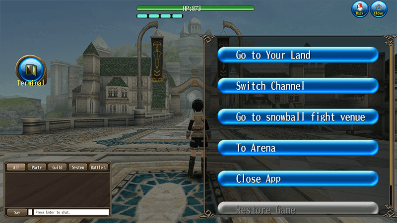 You can move to the venue of Arena from[ Menu > Terminal > To Arena ]. To return to Save Point, go to[ Menu > Terminal > Back to Town ].