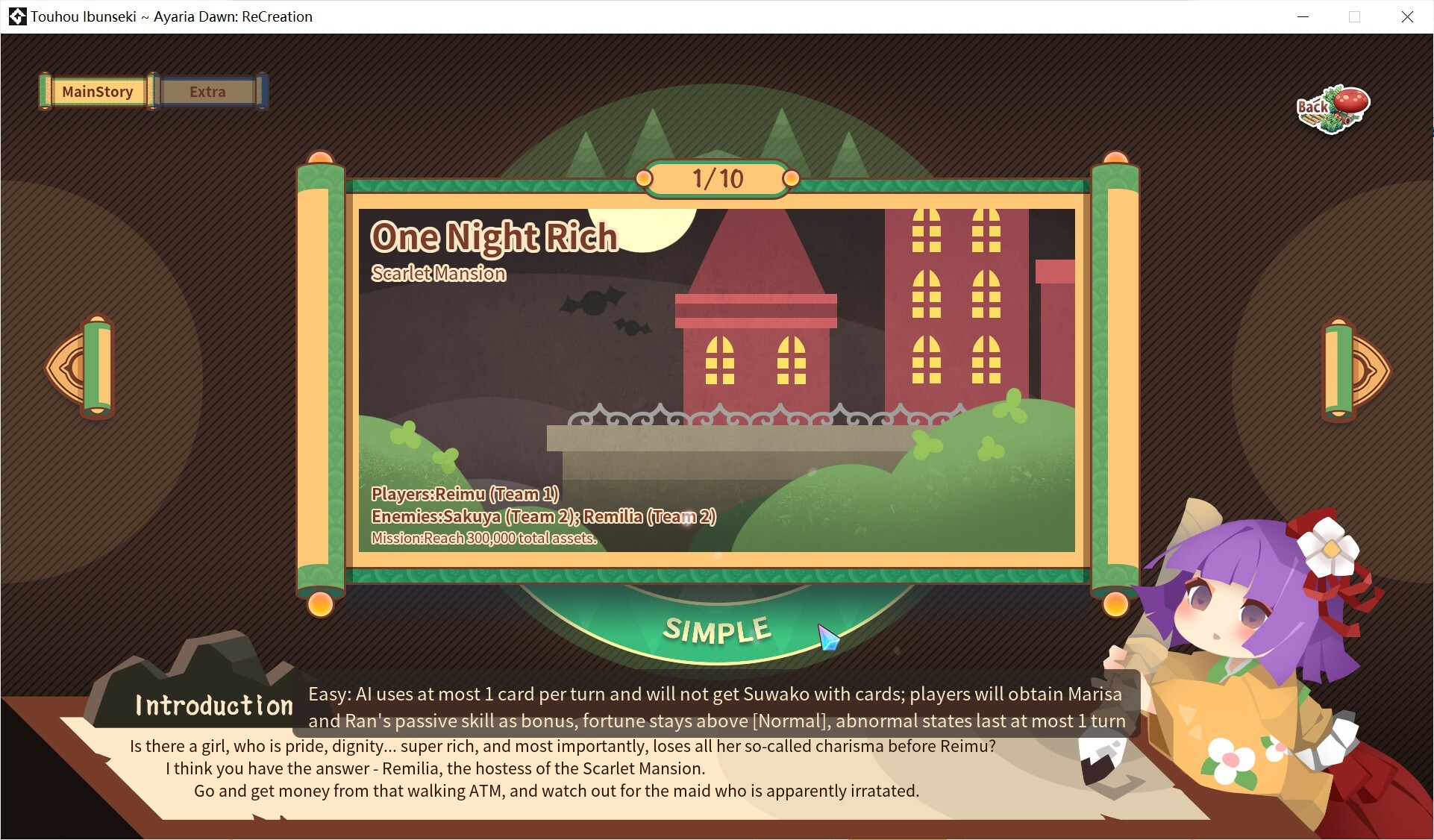 Easy - AI will use at most 1 card per-turn and will not use card to grab Suwako; player gets Ran and Marisa's passive skill as bonus at the beginning of the game. Player's fortune stays above "Normal" throughout the game. Abnormal states will last at most 1 turn for all players;